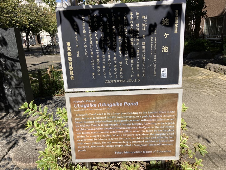 Ubagaike Pond used to be a large pond leading to the Sumida River in the past, but was reclaimed in 1891 and converted to a park by former Asakusa Ward. Its name is derived from the legend concerned with a stone pillow owned by Myoonji Temple (a sub-temple of Sensoji Temple). According to the legend, an old woman and her daughter lived in a house at Asajigahara. The old woman was killing many travelers with stone pillow, who were taken by her daughter asking for a night's lodging. When a traveler stayed there, the daughter acted as substitute for him in order to dissuade the old woman and killed by her with stone pillow. The old woman deeply lamented and threw herself into the pond. Afterwards, village people called it "Ubagaike" (mean old woman's pond).