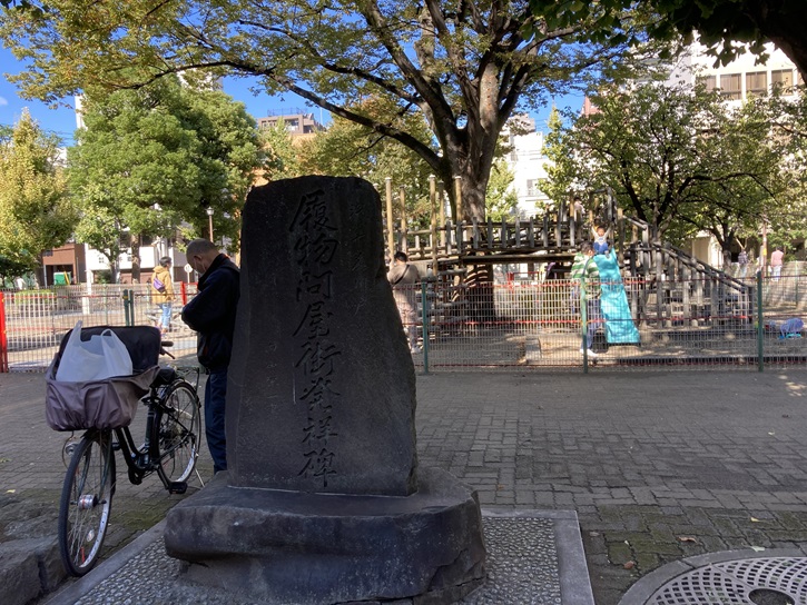 「履物問屋街発祥碑」の石碑も建っています。履物問屋街発祥碑は、花川戸公園内に平成二年(1990年)に建立されました。江戸時代後期の天保改革で、天保十三年(1842年)に日本橋から猿若町に幕府公認の芝居小屋「中村座」・「市村座」・「河原崎座」(後に「森田座」)が移転してきました。「猿若三座」と呼ばれ、役者や芝居関係者が多く住んだこともあり、和装履物問屋が軒を並べました。これが「花川戸」の問屋街発祥の誕生の要因となりました。現在でも、「江戸通り」沿いなどに、靴や鞄など革製品を取り扱っている専門店70店余りが軒を連ねる「花川戸靴・はきもの問屋街」があります。年末には「花川戸はきだおれ市」が開かれています。
