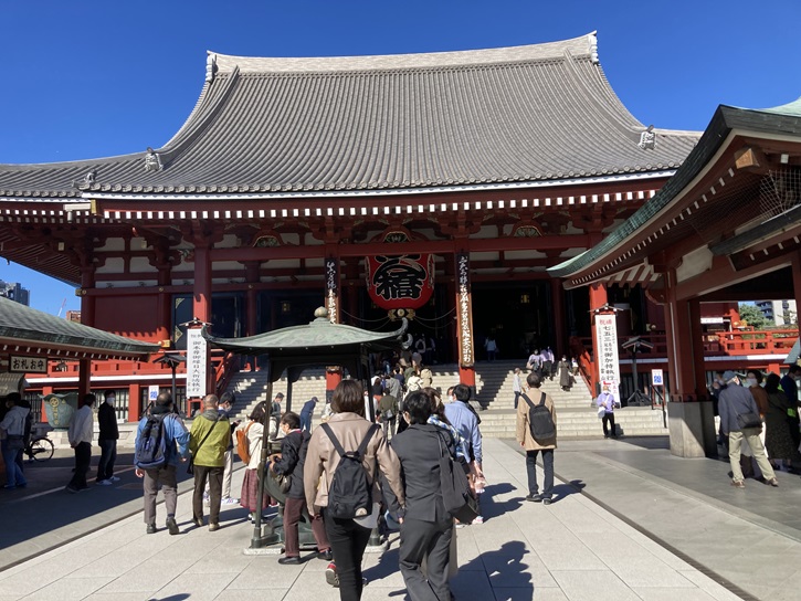 二天門からゴール地点の「浅草寺」に入ります。現在の二天門は慶安二年(1649年)に浅草寺の東門として創建されました。当初は境内にあった東照宮の随身門でしたが、明治十七年(1884年)に神仏分離によって随身門に安置されていた随身像が浅草神社に遷座した際、名称を随身門から二天門と改められました。扁額の「二天門」の文字は、太政大臣の 三条実美の筆になるものです。二天門は境内に残る江戸時代初期の古建築として貴重であり、国の重要文化財に指定されています。平成二十二年(2010年)に改修を終え、創建当時の鮮やかな姿に蘇りました。