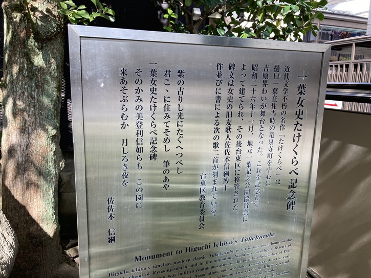 一葉博物館の真向かいにある一葉記念公園の敷地内には、樋口一葉の代表作である「たけくらべ」の記念碑が建っています。近代文学不朽の名作「たけくらべ」は、樋口一葉が住んでいた当時の竜泉寺町を中心に、吉原界隈が舞台となりました。これを記念して、昭和二十六年11月、地元の一葉記念公園協賛会によって石碑が建てられ、その後台東区に移管されました。碑文は一葉の旧友である歌人の佐佐木信綱作並びに書による二首が刻まれています。あまりに達筆すぎて私には読めませんが、石碑の隣には台東区が設置した案内板が立っていて、碑文について解説してあります。