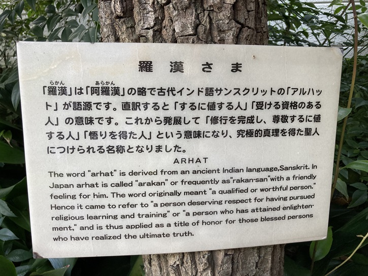 「羅漢」は「阿羅漢」の略で古代インド語サンスクリットの「アルハット」が語源です。直訳すると「するに値する人」「受ける資格のある人」の意味です。これから発展して「修行を完成し、尊敬するに値する人」「悟りを得た人」という意味になり、究極的真理を得た聖人につけられる名称となりました。