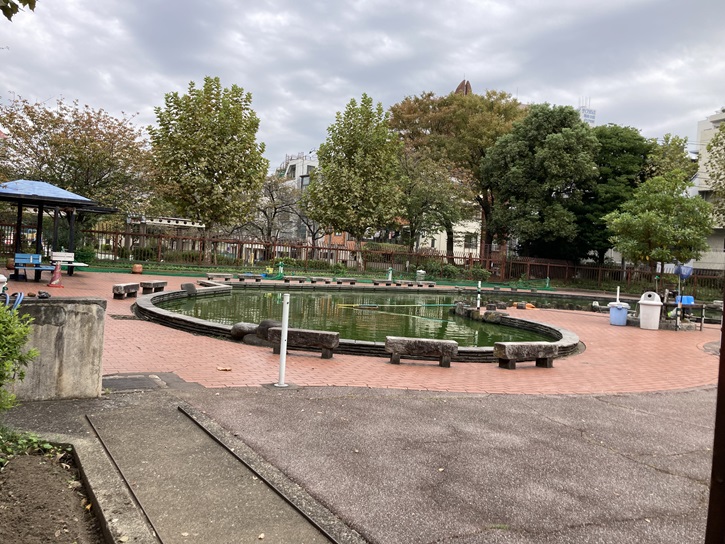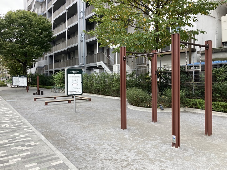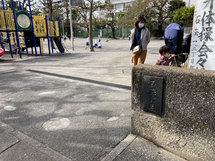 スタート地点の石浜公園から歩き始めます。「石浜」は、浅草の北・隅田川の西側一帯の古い地名です。現在の町名は「清川」になっていますが、石浜公園と隣の石浜小学校の名前に古い地名が残っています。石浜公園は台東区内に15ケ所ある関東大震災からの復興の際に小学校と公園とをセットで整備した復興小公園のうちのひとつです。ちなみに、隅田公園は復興大公園になります。公園の中心部分にラジオ体操台があります。震災復興公園にはラジオ体操台が設置されていることが多いのですが、当時はこうした演台や指揮台のようなものが重要視されていたのでしょう。面積2972平方メートルの広場の中に様々な遊具が点在しています。カラフルな色彩のマットつき大型複合遊具・マットつきブランコ・ツーウェイスベリ台に加えて、フェンスで囲われた砂場も備えています。周囲には、イヌマキの木・カヤの木・ビワの木・ミカン類の木が育ち、日時計のオブジェが設置されています。