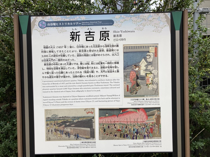 明暦の大火(1657年)後に、日本橋にあった元吉原から浅草北部の農村部に移転してきたことにより、新吉原と呼ばれた遊郭。最盛期には3、000人の遊女が在籍していた。遊郭の周囲には堀がめぐらされ、出入口は吉原大門の一箇所のみだった。新吉原の中央にあった大通りでは、春には桜、秋には紅葉を一時的に移植し、特別な空間を演出していた。浮世絵を見てみると、遊客が名残を惜しんで振り返った位置にあったとされる「見返り柳」や、大門(おおもん)と桜並木と艶やかな遊女の様子が描かれ、当時の賑わいを見ることができる。
