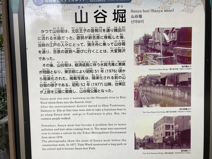 かつて山谷堀は、北区王子の音無川を通り隅田川に流れる水路だった。遊郭が新吉原に移転した後、当時の江戸の人々にとって、猪牙舟に乗って山谷堀を通り、吉原の遊郭へ遊びに行くことは、大変贅沢であった。その後、山谷堀は、経済成長に伴う水質汚濁と悪臭が問題となり、東京都により昭和五十一年(1976年)頃から暗渠化された。掲載写真は、暗渠化される前の山谷堀の様子である。昭和五十二年(1977年)以降、台東区が上部を公園に整備し、山谷堀公園となった。