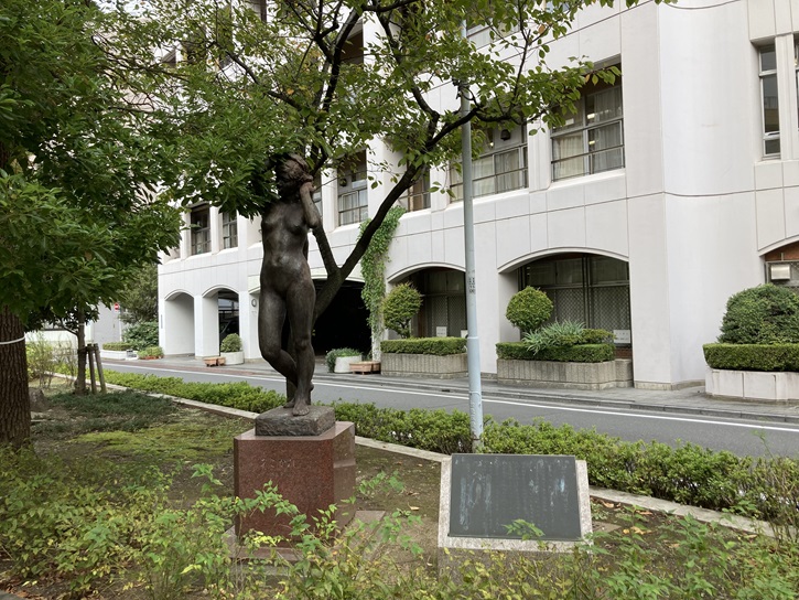 見所ポイントEの「あこがれ像」は、都立浅草高等学校に面した山谷堀公園内に建っています。作者は朝倉文夫氏です。