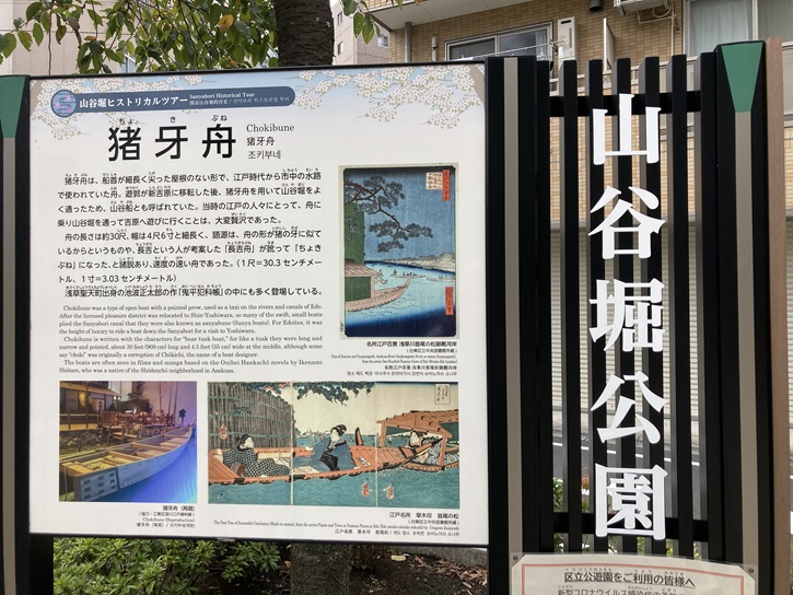 猪牙舟は、船首が細長く尖った屋根のない形で、江戸時代から市中の水路で使われていた舟。遊郭が新吉原に移転した後、猪牙舟を用いて山谷堀をよく通ったため、山谷船とも呼ばれていた。当時の江戸の人々にとって、舟に乗り山谷堀を通って吉原へ遊びに行くことは、大変贅沢であった。舟の長さは約30尺、幅は4尺6寸と細長く、語源は、舟の形が猪の牙に似ているからというものや、長吉という人が考案した「長吉舟」が訛って「ちょきぶね」になった、と諸説あり、速度の速い舟であった(1尺=30.3センチメートル、1寸=3.03センチメートル)。浅草聖天町出身の池波正太郎の作「鬼平犯科帳」の中にも多く登場している。
