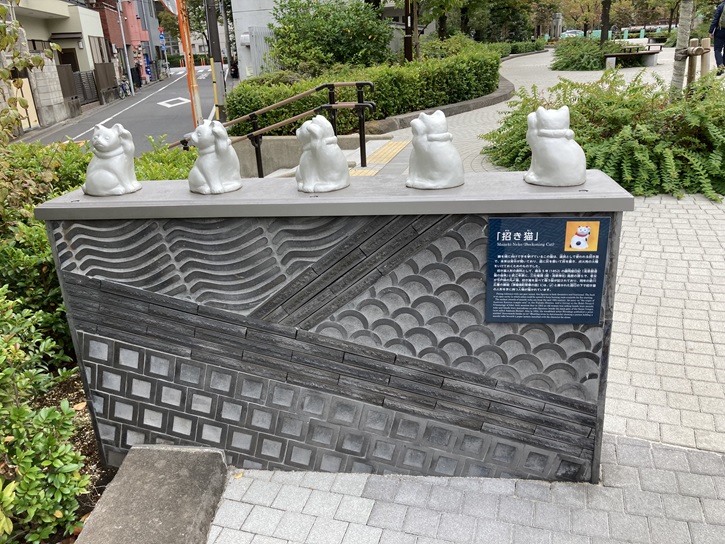 Sitting cat figures facing sideways have been restored on the model of Tangible Folk Cultural Properties of Taito City. Cat figures sitting above are the examples of the shapes of the Sitting Cat. A variety of old sitting cat and beckoning cat figures of various sizes still exist, and sitting cats facing sideways are portrayed in woodblock prints of the Edo period.
