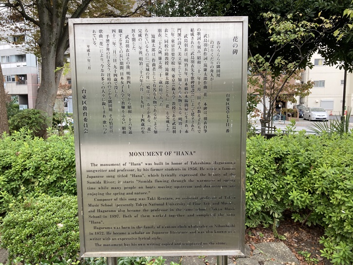 白鬚橋の袂に見所ポイントKの「明治天皇行幸・對鴎荘遺跡の碑」の案内板が立っています。