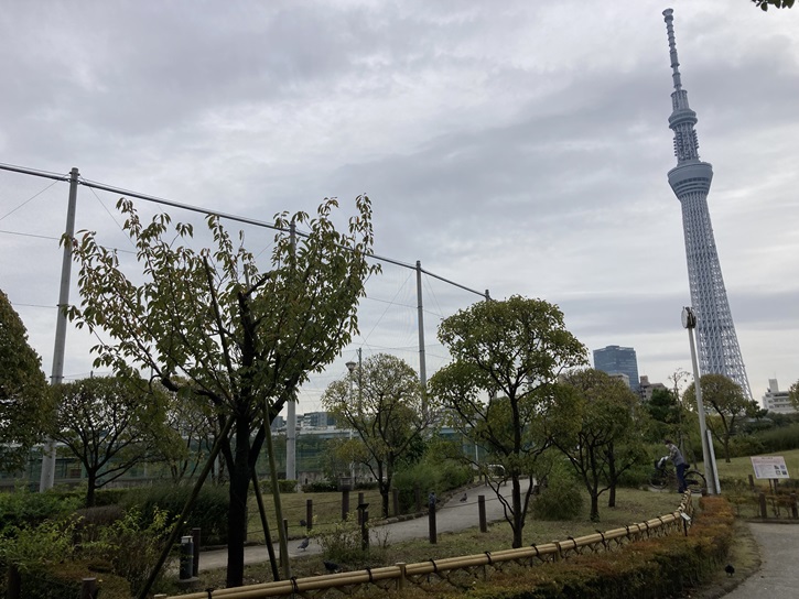 ゴール地点の石浜公園に戻ってきました。スカイツリーがよく見えますね。ということで、台東区で十一番目の「Kコース(清川地区健康推進委員おすすめ)」を歩き終えました。地区健康推進委員おすすめコースはこれで終了し、次は台東区で十二番目の「Lコース(上野・浅草コース)」を歩きます。