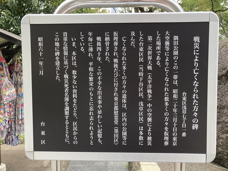 隅田公園のこの一帯は、昭和二十年三月十日の東京大空襲等により亡くなられた数多くの方々を仮埋葬した場所である。第二次世界大戦(太平洋戦争)中の空襲により被災した台東区民(当時下谷区民、浅草区民)は多数に及んだ。亡くなられた多くの方々の遺体は、区内の公園等に仮埋葬され、戦後だびに付され東京都慰霊堂(墨田区)に納骨された。戦後四十年、この不幸な出来事や忌わしい記憶も、年毎に薄れ、平和な繁栄のもとに忘れ去られようとしている。いま、本区は、数少ない資料をたどり、区民からの貴重な情報に基づく戦災死者名簿を調製するとともに、この地に碑を建立した。