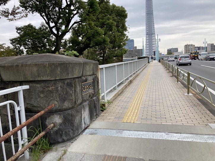 言問橋の手前の小さな広場に「東京大空襲犠牲者追悼碑」が建っていて、「あゝ 東京大空襲 朋よやすらかに」の碑文が記されています。