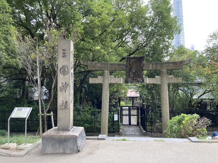 gate can be seen in the foreground, but the impressive Mimeguri Shrine was a famous