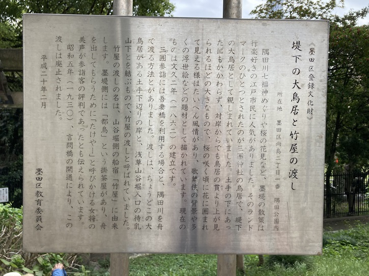 三囲神社の大鳥居と隅田川の対岸の山谷堀とを結んでいた渡しは、「竹屋の渡し」と呼ばれていました。