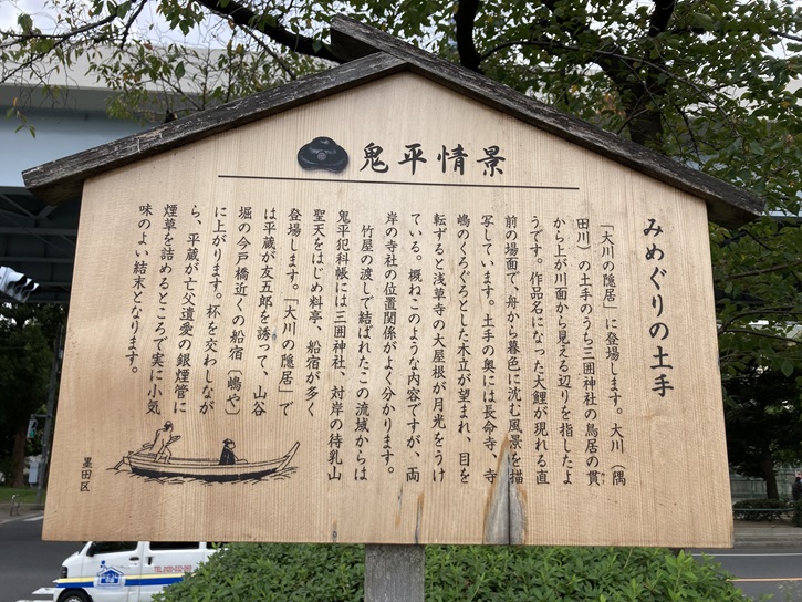 「大川の隠居」に登場します。大川(隅田川)の土手のうち三囲神社の鳥居の貫から上が川面から見える辺りを指したようです。作品名になった大鯉が現れる直前の場面で、舟から暮色に沈む風景を描写しています。土手の奥には長命寺、寺嶋のくろぐろとした木立が望まれ、目を転ずると浅草寺の大屋根が月光をうけている。概ねこのような内容ですが、両岸の寺社の位置関係がよく分かります。竹屋の渡しで結ばれたこの流域からは鬼平犯科帳には三囲神社、対岸の待乳山聖天をはじめ料亭、船宿が多く登場します。「大川の隠居」では平蔵が友五郎を誘って、山谷堀の今戸橋近くの船宿〔嶋や〕に上がります。杯を交わしながら、平蔵が亡父遺愛の銀煙管に煙草を詰めるところで実に小気味のよい結末となります。