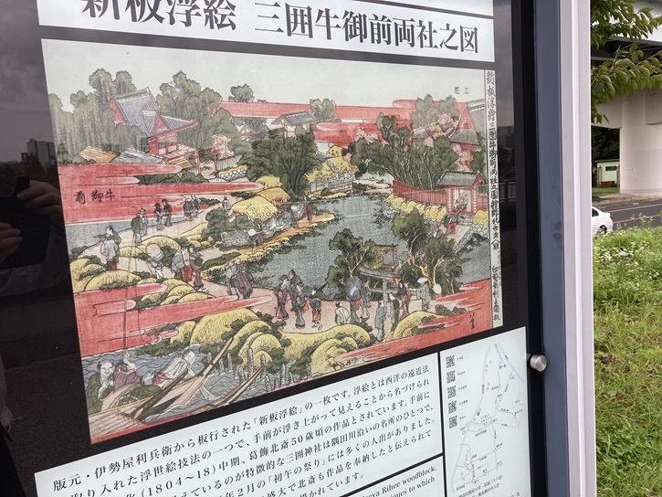版元・伊勢屋利兵衛から板行された「新板浮絵」の一枚です。浮絵とは西洋の遠近法を取り入れた浮世絵技法の一つで、手前が浮き上がって見えることから名づけられました。文化(1804年〜1818年)中期、葛飾北斎50歳頃の作品とされています。手前に鳥居のあたまだけ見えているのが特徴的な三囲神社は隅田川沿いの名所のひとつで、かつて田中稲荷と呼ばれ毎年2月の「初午の祭り」には多くの人出がありました。寛政十一年(1799年)年のご開帳は特に盛大で北斎も作品を奉納したと伝えられています。画面左奥には牛御前(現牛嶋神社)も描かれています。