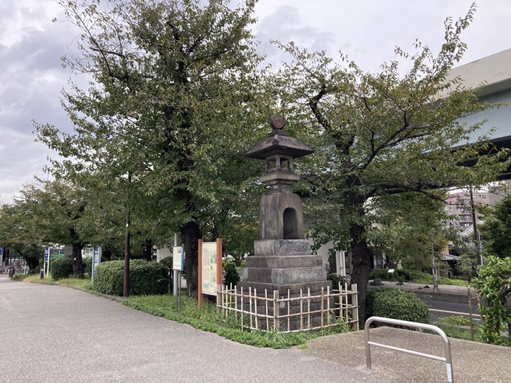 土手の上の遊歩道の一画に古びた常夜灯が保存されています。