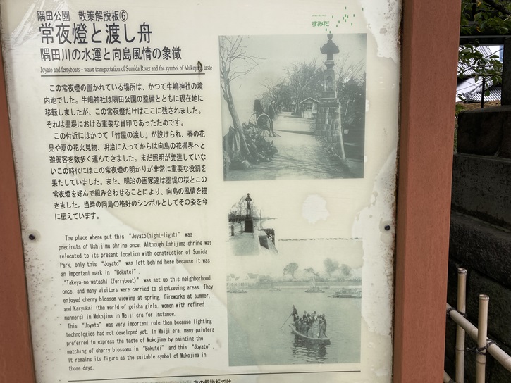 The place where put this "Joyato (night-light)" was precincts of Ushijima shrine once. Although Ushijima shrine was relocated to its present location with construction of Sumida Park, only this "Joyato" was left behind here because it was an important mark in "Bokutei". "Takeya-no-watashi (ferryboat)" was set up this neighborhood once, and many visitors were carried to sightseeing areas. They enjoyed cherry blossom viewing at spring, fireworks at summer, and Karyukai (the world of geisha girls, women with refined manners) in Mukojima in Meiji era for instance. This "Joyato" was very important role then because lighting technologies had not developed yet. In Meiji era, many painters preferred to express the taste of Mukojima by painting the matching of cherry blossoms in "Bokutei" and this "Joyato". It remains its figure as the suitable symbol of Mukojima in those days..