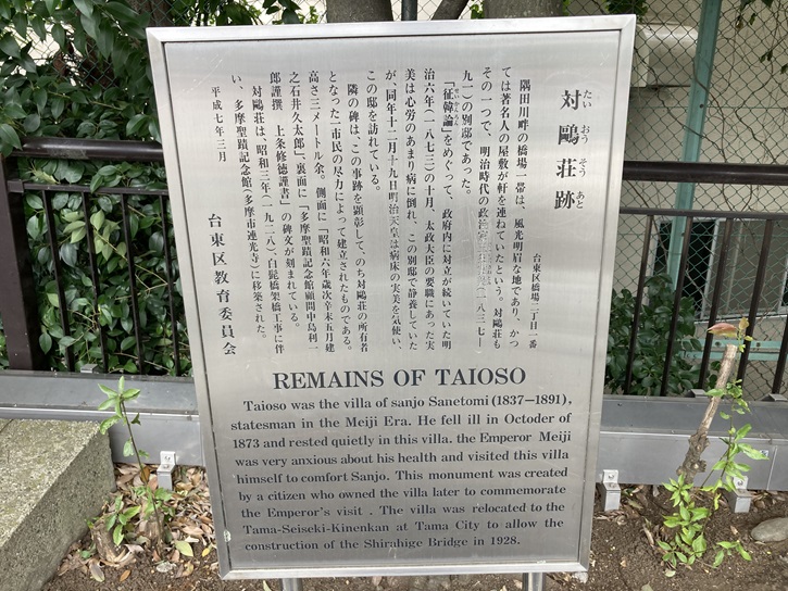 隅田川畔の橋場一帯は、風光明眉な地であり、かつては著名人の屋敷が軒を連ねていたという。対鴎荘もそのひとつで、明治時代の政治家三条実美(一八三七年〜一八九一年)の別邸であった。「征韓論」をめぐって、政府内に対立が続いていた明治六年(一八七三年)の十月、太政大臣の要職にあった実美は心労のあまり病に倒れ、この別邸で静養していたが、同年十二月十九日明治天皇は病床の実美を気遣い、この邸を訪れている。隣の碑は、この事跡を顕彰して、のち対鴎荘の所有者となった一市民の尽力によって建立されたものである。高さ三メートル余。側面に「昭和六年歳次辛末五月建之石井久太郎」、裏面に「多摩聖蹟記念館顧問中島利一郎謹撰 上条修徳謹書」の碑文が刻まれている。対鴎荘は、昭和三年(一九二八年)、白鬚橋架橋工事に伴い、多摩聖蹟記念館(多摩市連光寺)に移築された。