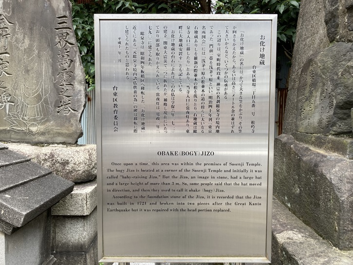 「お化け地蔵」の名には、かつて大きな笠をかぶり、その笠が向きをかえたから、あるいは高さ三メートル余の並はずれて大きいからなど、いくつかの伝承がある。この辺りは、室町時代以来、禅宗の名刹総泉寺の境内地であった。門前一帯を浅茅ヶ原といい、明治四十年刊「東京名所図会」には「浅茅ヶ原の松並木の道の傍らに大いなる石地蔵ありしを維新の際並木の松を伐りとり、石地蔵は総泉寺入口に移したり」とあり、「当寺入口に常夜灯あり、東畔に大地蔵安置す」とも記している。お化け地蔵の台石によれば、この石仏は享保六年(1721年)の建立。関東大震災で二つに折れたが、補修し現在にいたっており頭部も取りかえられている。常夜灯は、寛政二年(1790年)に建てられた。総泉寺は、昭和四年板橋区へ移転した。「お化け地蔵」近くにある「元総泉寺境内諸仏供養の為」の碑は移転に際し建てられたものと思われる。