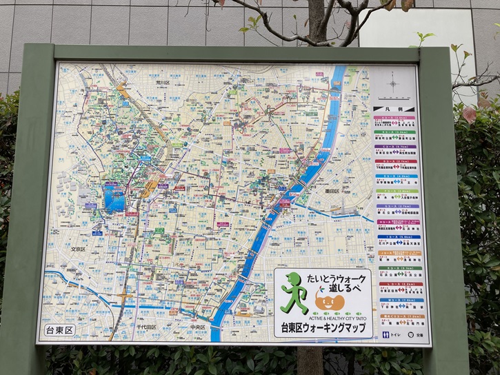 道路の脇に「台東区ウォーキングマップ」の案内板が立っています。「Aコース」から「Mコース」と「橋めぐりコース」の全ルートが地図に書き込まれています。いろんなコースを歩いたものです。