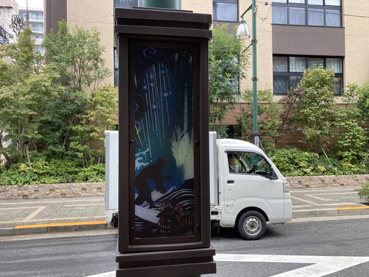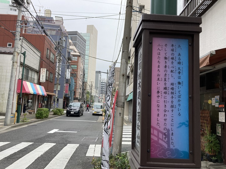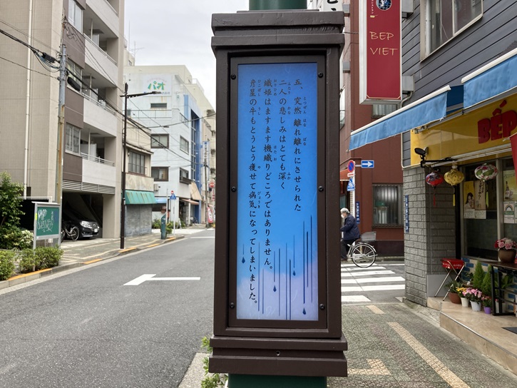 何故か歩道脇の街路灯に、七夕物語がイラスト付きで並んでいます。