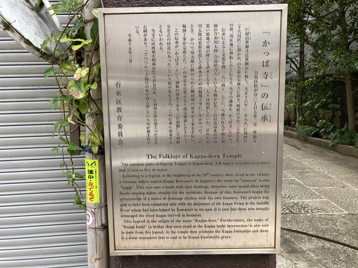 The common name of Sogenji Temple is Kappa-dera. A Kappa is a mythical creature that is said to live in water. According to a legend, at the beginning of the 19th century there lived in the vicinity a raincoat maker named Kappa Kawataro. In Japanese the word for "raincoat" is also "kappa". This was once a basin with poor drainage, therefore rains would often bring floods causing undue trouble for the residents. Because of this, Kawataro began the construction of a series of drainage ditches with his own finances. The project was, said to have been completed only with the assistance of the kappa living in the Sumida River whom had been helped by Kawataro in the past. It is said that those who actually witnessed the river kappa thrived in business. This legend is the origin of the name "Kappa-dera." Furthermore, the name of