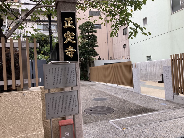 合羽橋南交差点の手前に正定寺があります。正定寺は、慶長十八年(1613年)に伝国によって開山されました。当初は神田にありましたが、その後下谷に移転し、正徳四年(1714年)に松が谷の此の地に移転しました。