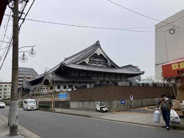 曹源寺の角を右折し、南下します。右手に見所ポイントAの「本覚寺」があります。本覚寺は、円了院成身日満(俗名関根卯兵衛)が開基し、上行院日覚が開山となって天正十九年(1591年)に馬喰町で創建されました。明暦三年(1657年)の大火の後、この地へ移転したといわれています。江戸十大祖師の一社になっています。江戸十大祖師とは、江戸にある10ヶ寺の日蓮宗寺院を参拝することにより、祖師(日蓮)のご利益にあずかろうとする民間信仰のことです。
