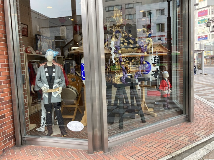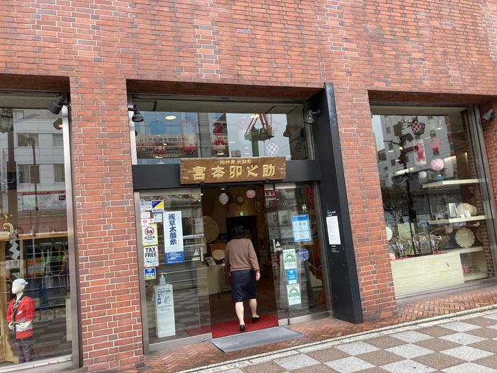 国際通りと交差する雷門一丁目交差点の角に宮本卯之助商店西浅草店があります。初代清助が文久元年(1861年)に土浦で山城屋という屋号で太鼓店を創業したのが始まりで、明治二十六年(1893年)に四代目卯之助が浅草聖天町に店を構えました。大正十五年(1926年)に大正天皇の大葬用楽器一式を製作し、その後宮内庁御用達となりました。現在の西浅草店は昭和二十三年(1948年)に開店しました。浅草神社御本社神輿(一之宮・二之宮・三之宮)は宮本卯之助商店が製作したものです。昭和六十三年(1988年)には、西浅草店の4階に世界初となる太鼓専門の博物館「太皷館」が開設されました。
