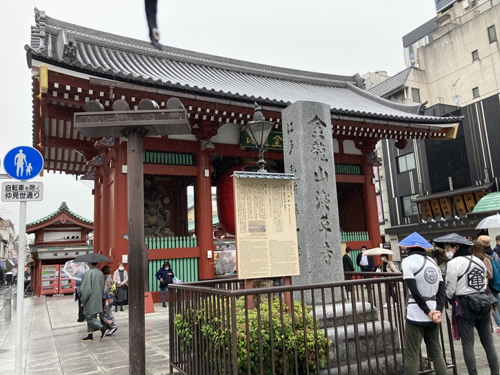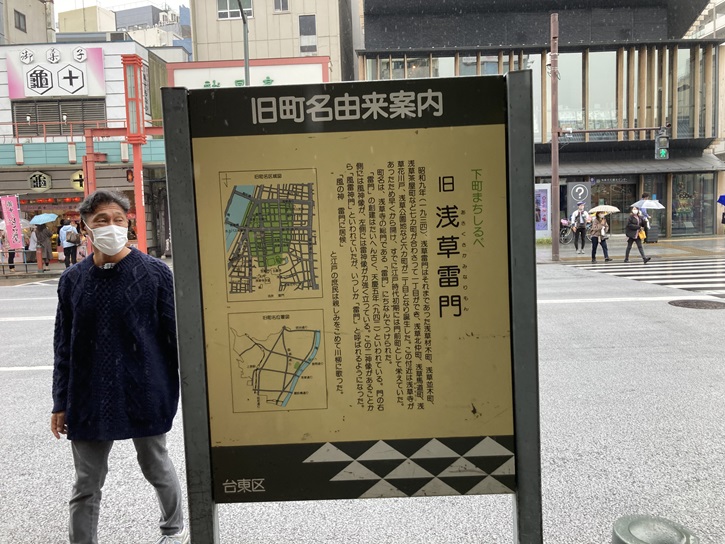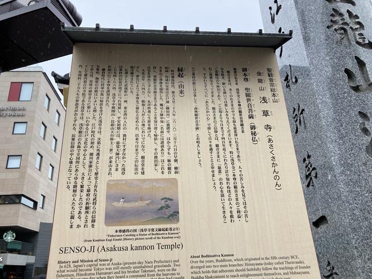 雷門広場には浅草寺の案内板が立っています。英語表記の案内文を最後まで読んだ外国人はまずいないでしょう。