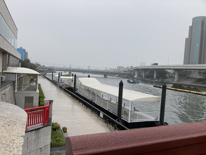 水上バス浅草発着場から隅田川を隔てて、東京スカイツリーの全景が眺められます。両脇の建物は、墨田区役所とアサヒビールタワーです。アサヒビールタワーの隣にはスーパードライホールが建っています。スーパードライホールは、吾妻橋の袂にあった旧吾妻橋工場跡地の再開発で建設され、昭和六十四年/平成元年(1989年)に竣工しました。屋上には名物となっている巨大モニュメントが設置されています。燃え盛る炎を形象した「フラムドール(フランス語で金の炎の意味)」と呼ばれるもので、アサヒビールの燃える心を象徴するとされています。オブジェが炎を表すのに対して、その下のスーパードライホールは聖火台をイメージしたものだといわれています。当初の構想では、炎がビルを貫くような形に建てるつもりだったそうですが、構造上問題があり、炎の部分が横向きになったということです(あくまで噂です)。その特徴的な形状から、「うんこビル」・「うんちビル」の愛称でも呼ばれています。