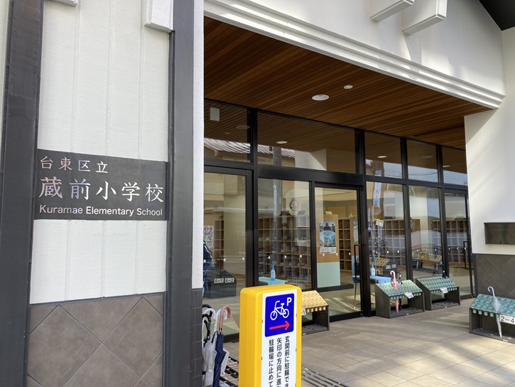 蔵前四丁目の南西角で左折しますと、国際通りの手前に蔵前小学校があります。蔵前小学校は、平成十五年4月1日に、精華小学校・小島小学校・済美小学校の三校が統合されて開校しました。明治七年から明治九年まで文豪夏目漱石が在学していました。オフィスビルのような外観をしていて、随分と近代的な校舎ですね。