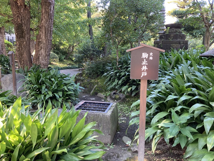 駒止石と駒止井戸は、寛永八年(1631年)の秋、阿部豊後守が隅田川氾濫の様子を見に来た際に、馬を繋いで休憩をした際の石と井戸と伝えられています。