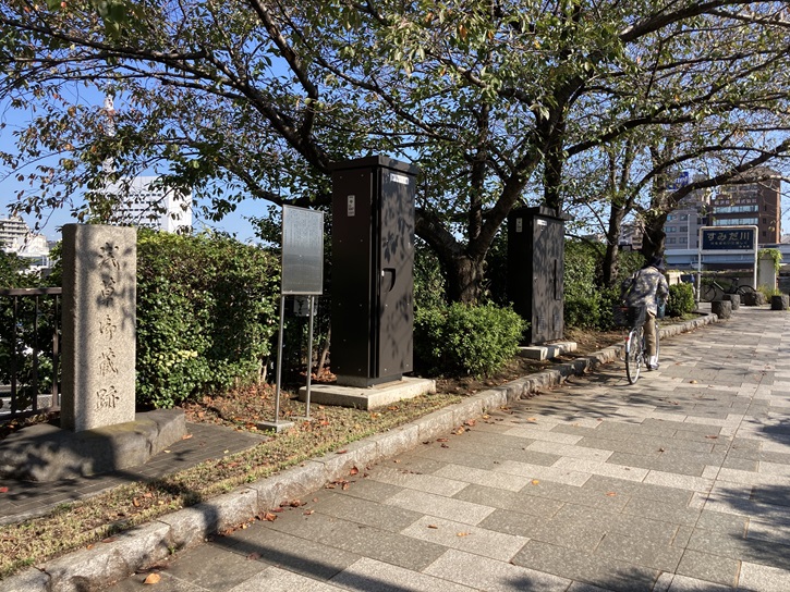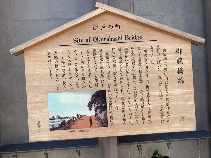 御蔵橋は、隅田川に面した松前伊豆守の屋敷のそばの入り堀に架った橋で、この辺りにありました。堀の突き当たりは、御竹蔵(または御蔵地)という幕府の材木蔵でした。隅田川から船で運んだ木材や竹の荷を、この堀から引き入れて、御蔵地へと収納するようにできていたのです。後に米蔵として使用され、現在は国技館や江戸東京博物館などが建っています。御蔵橋は、池波正太郎の「鬼平犯科帳特別長篇 雲竜剣流れ星」にも登場していて、「左側は、まんまんたる水をたたえた大川が黒く横たわり、ここへ来ると、まったく人影もなかった。・・・幅一間半、長さ