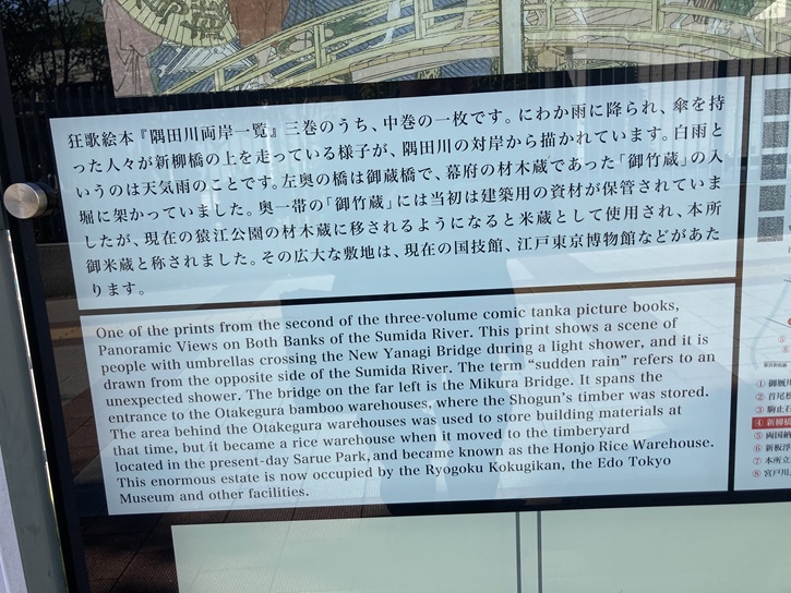 狂歌絵本「隅田川両岸一覧」三巻のうち、中巻の一枚です。にわか雨に降られ、傘を持った人々が新柳橋の上を走っている様子が、隅田川の対岸から描かれています。白雨というのは天気雨のことです。左奥の橋は御蔵橋で、幕府の材木蔵であった「御竹蔵」の入堀に架かっていました。奥一帯の「御竹蔵」には当初は建築用の資材が保管されていましたが、現在の猿江公園の材木蔵に移されるようになると米蔵として使用され、本所御米蔵と称されました。その広大な敷地は、現在の国技館、江戸東京博物館などが(ある)あたり(になり)ます。