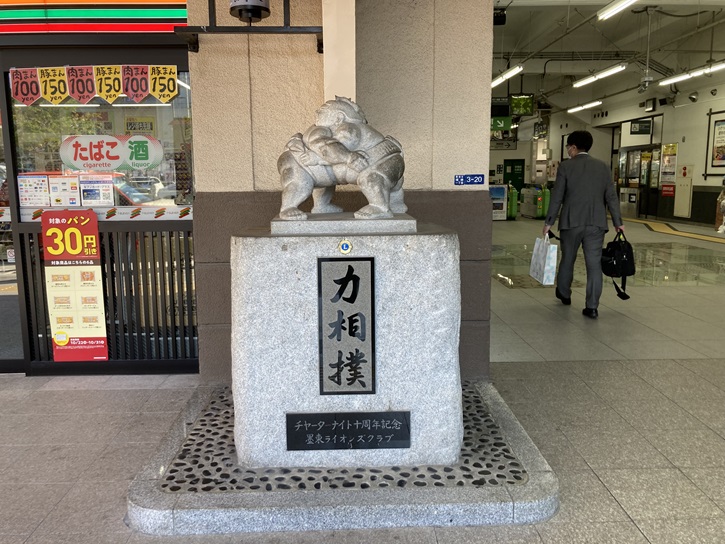 ゴール地点の両国駅に着きました。駅の入口には、力相撲の像が建っています。