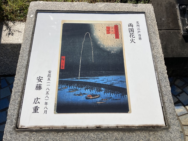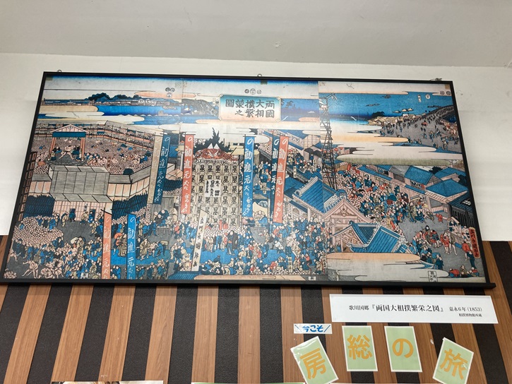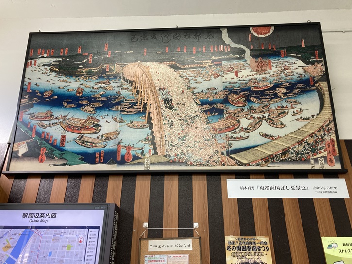 駅の構内には、両国の二大看板である「両国橋の花火大会」の様子と「大相撲興業」の錦絵が掲げられています。尚、相撲興行は天保四年(1833年)から両国の回向院で催されていました。