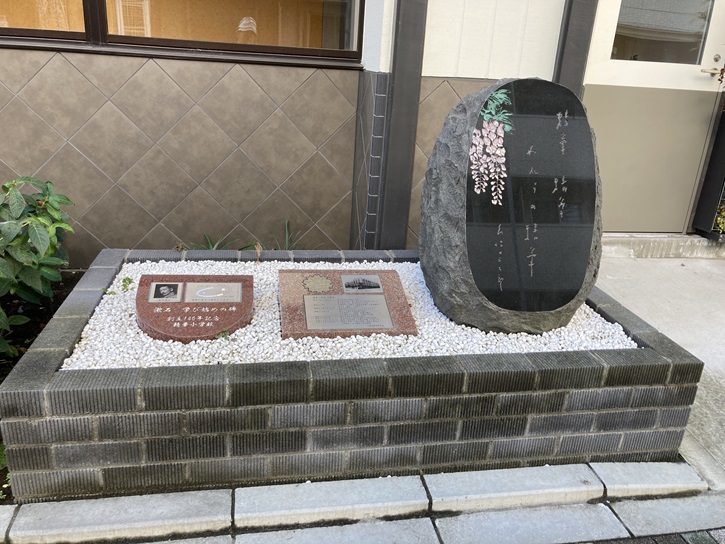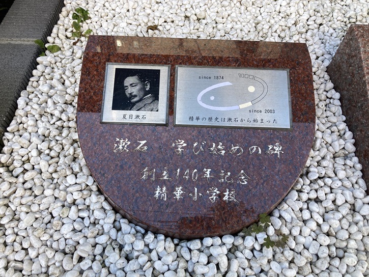 「漱石 学び始めの碑」と久保田万太郎揮毫の「精華 精華 われらの精華」の石碑、それに「精華小学校 沿革史」の碑が玉砂利の中に置かれています。