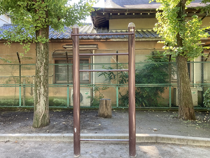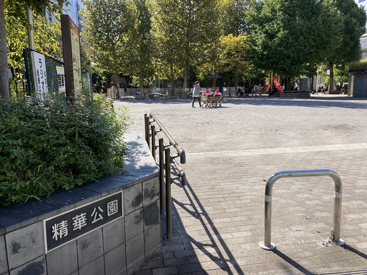 精華公園は、台東区内に15か所ある復興小公園のうちのひとつです。道路を挟み、蔵前小学校(旧精華小学校)に隣接しています。複合遊具やブランコ・鉄棒などの遊具が設置されていて、区立公園のなかで一番大きな砂場があります。また、環境に配慮して、自然観察のできるビオト−プや屋根を緑化したトイレが設置されています。一時集合場所に指定されていて、非常用照明やマンホールトイレ・かまどベンチなどの防災設備が整備されています。開設当初に設置された施設は現在残されていませんが、公園の形状は当時のままであり、砂場やトイレなど当時と同等の機能を有する施設があります。ぶら下がり棒も設置されていますね。
