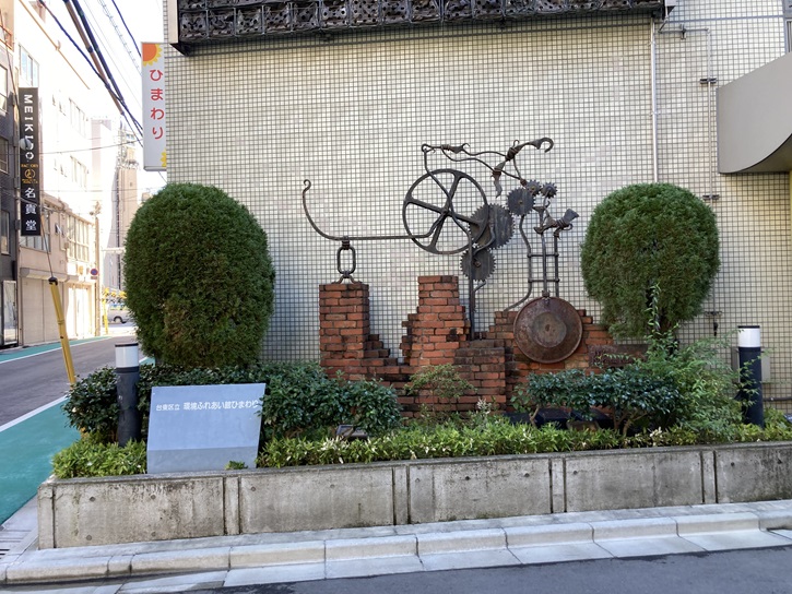 蔵前小学校の北東角を右折した先に、見所ポイントAの「環境ふれあい館ひまわり」があります。環境ふれあい館ひまわりは、様々な環境問題やエコ・リサイクルについての情報の提供や体験を通して環境やリサイクルへの理解を深め、子どもから大人まで広く環境学習の場を提供しています。草花・昆虫・メダカなど、様々な生物が生息するビオトープのある精華公園の前にあり、自然環境学習の提供やリサイクル活動、環境に関する情報提供などを行っています。ひまわりの妖精をイメージしたキャラクターの「まわるん」には、環境を守り育くむ願いと循環型社会の実現の思いが込められています。2階はリサイクル活動室、3階はリサイクルショップで、掲示板による物の授受や交換・販売などが行われています。4階は環境学習室展示室、5階の環境情報室・ふれあいサロンは、環境に関する学習や情報の展示のスペースとなっています。6階のくらまえオレンジ図書館は環境に関する本の貸出、7階の集会室ではイベントなどを開催しています。学校・地域・職場など様々な場面でそれぞれが主体的に環境学習に取り組めるよう、情報の提供や人材育成、交流支援を行っています。エントランスの前には、リサイクルの廃品で作られた自転車のオブジェが展示されています。