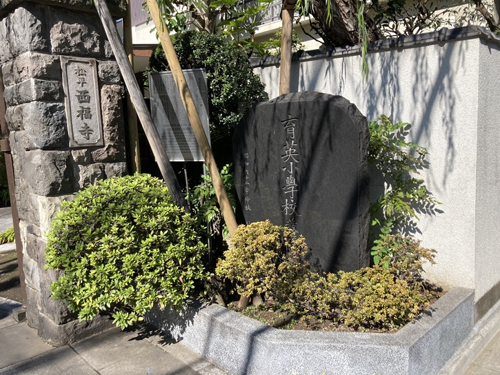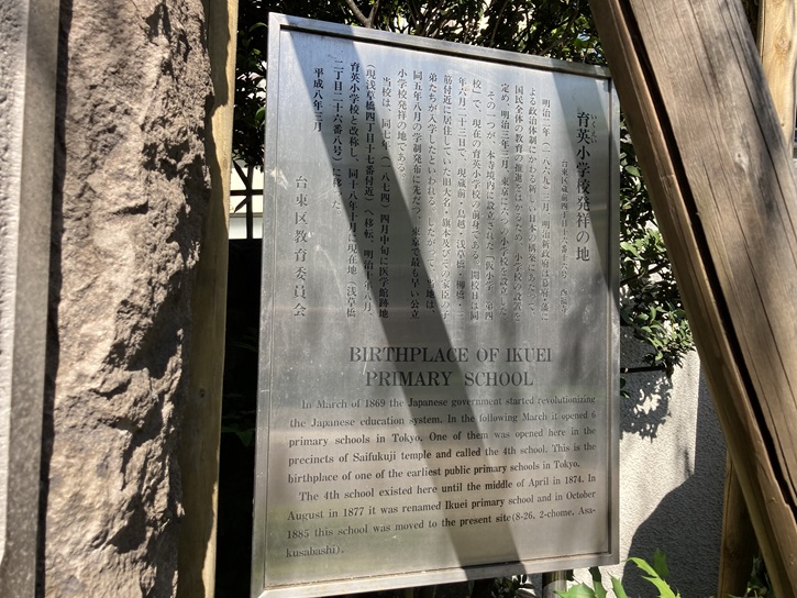 明治二年(1869年)三月、明治新政府は幕府・藩による政治体制にかわる新しい日本の構築にあたって、国民全体の教育の推進をはかるため、小学校の設置を定め、明治三年三月、東京に六つの小学校を設立した。その一つが、本寺境内に設立された「仮小学 第四校」で、現在の育英小学校の前身である。開校日は同年六月二十三日で、現蔵前・鳥越・浅草橋・柳橋・三筋附近に居住していた旧大名・旗本及びその家臣の子弟たちが入学したといわれる。したがって、当地は、同五年八月の学制発布に先だつ、東京で最も早い公立小学校発祥の地である。当校は、同七年(1874年)四月中旬に医学館跡地(現浅草橋四丁目十七番附近)へ移転、明治十年八月、育英小学校と改称し、同十八年十月に現在地(浅草橋二丁目二十六番八号)に移った。