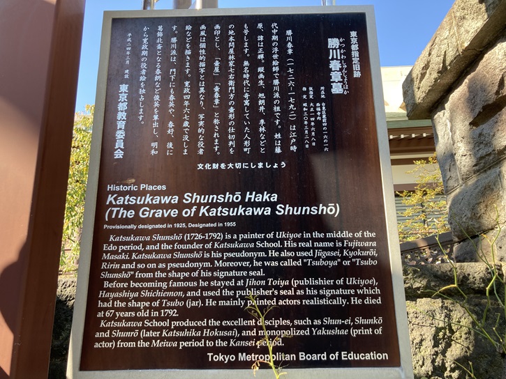 The tomb of Shunsho Katsukawa, one of the great artists who established the golden age of Edo Ukiyoe, is in this temple.