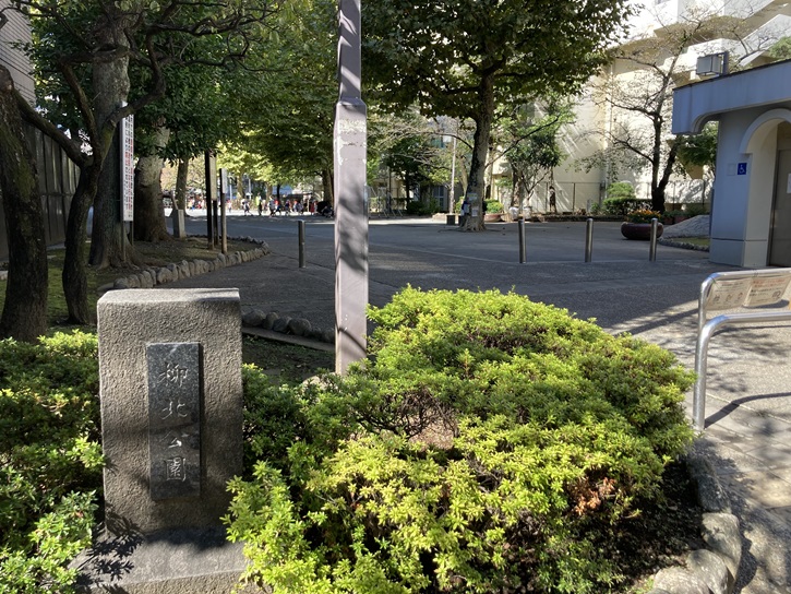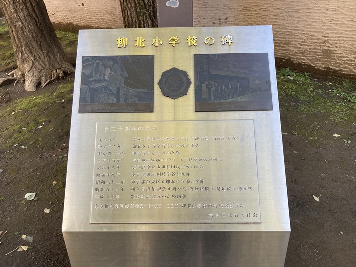 園内に旧柳北小学校の記念碑が建っています。柳北小学校は、大正十二年(1923年)の関東大震災後に建てられた鉄筋コンクリート製の復興小学校のひとつです。東京市内では比較的早い大正十五年(1926年)の秋に竣工しました。同時期に復興計画で計画された柳北公園も開設しています。校舎は当時としてはモダンな建築様式であり、玄関にはアールデコ風の装飾がなされています。平成十三年(2001年)に隣接する育英小学校と合併し、明治九年から100年以上続いた柳北小の歴史はこの年に幕を閉じました。しかし、大正時代末に建てられた柳北小の校舎は壊されず、平成十五年(2003年)からフランス人子女が通う「東京リセ・フランコ・ジャポネ東京校」の中等科・高等科の校舎として再び利用されています。