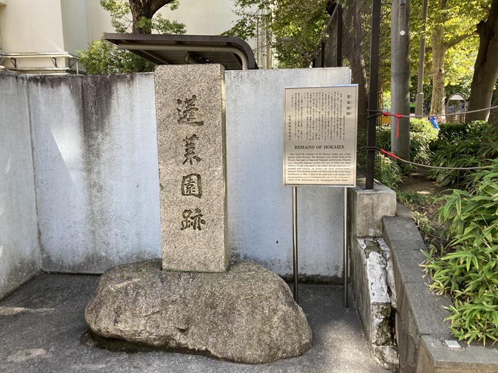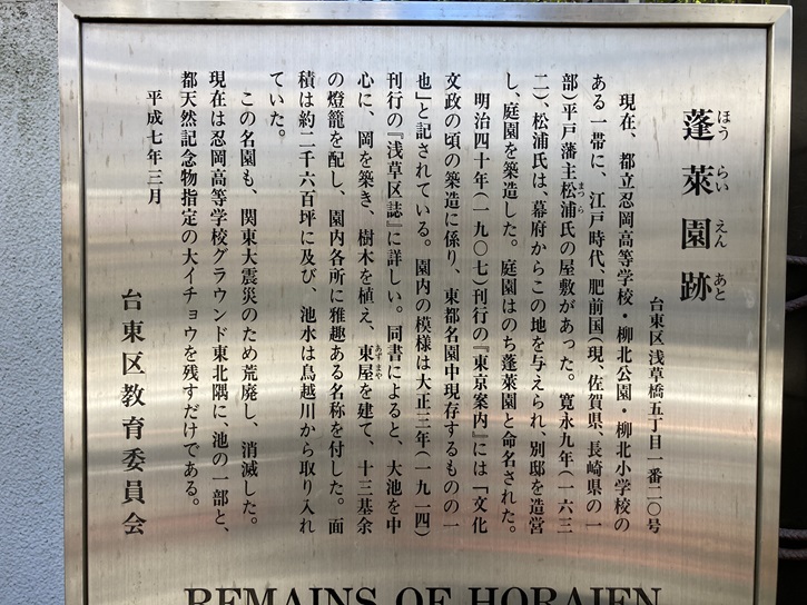 旧町名由来案内板にも、忍岡高校と蓬莱園の関わりが解説されています。
