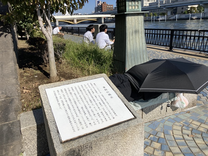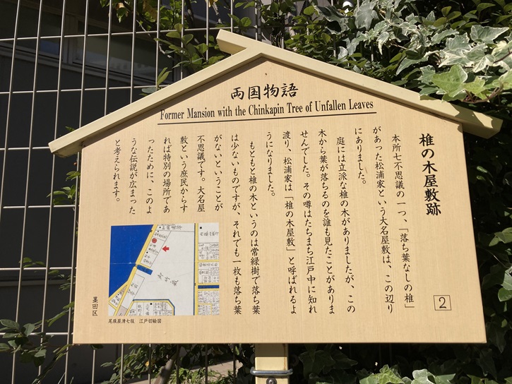 隅田川に面した松浦豊後守の屋敷に植わっていた椎の木からは葉っぱが地面に落ちてこなかったという伝説があります。