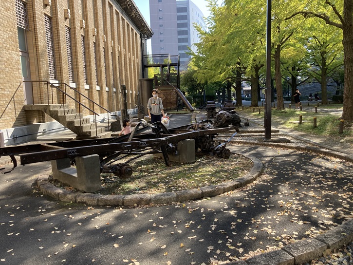 自動車のボディが焼失し、シャシーだけが残ったもの。この自動車は車両番号第一号という古い歴史を持ち、銀座の明治屋商店で震災直前まで使用されていたという。