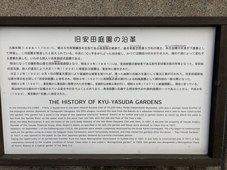 "Kyu-Yasuda Gardens". Taking the opportunity of its jurisdiction transfer from the Tokyo Metropolitan Government to Sumida City in 1967, it was fully re-constructed and, in 1971, it was completely restored to the original condition of former times when it was called a "distinguished garden". In 1996, this garden was designated a Metropolitan Place of Scenic Beauty as a typical garden of the Meiji Era.