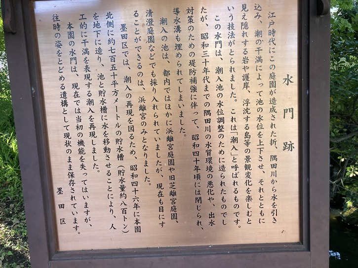 江戸時代にこの庭園が造成された折、隅田川から水を引き込み、潮の干満によって池の水位を上下させ、それとともに見え隠れする岩や護岸、浮沈する島等の景観変化を楽しむという技法がとられました。これは「潮入」と呼ばれるものです。この水門は、潮入池の水位調整のために造られたものでしたが、昭和三十年代までの隅田川の水質環境の悪化や、出水対策のための堤防補強に伴って、昭和四十年頃には閉じられ、導水溝も埋められてしまいました。潮入の池は、都内ではほかに浜離宮庭園や旧芝離宮庭園、清澄庭園などでも採り入れられていましたが、現在も目にすることができるのは、浜離宮のみとなりました。墨田区では、潮入の再現を図るため、昭和四十六年に本園北側に約七百五十平方メートルの貯水槽(貯水量約八百トン)を地下に造り、池と貯水槽に水を移動させることにより、人工的に干満を表現する潮入を再現しました。本園の水門は、現在では当初の機能を失ってはいますが、往時の姿をとどめる遺構として現状のまま保存されています。