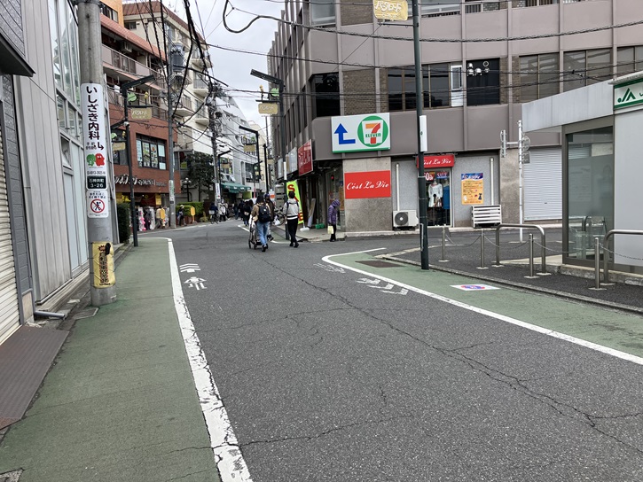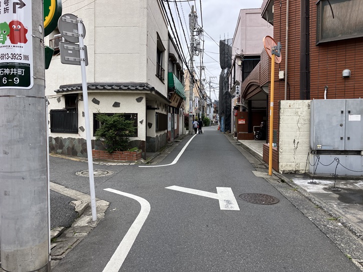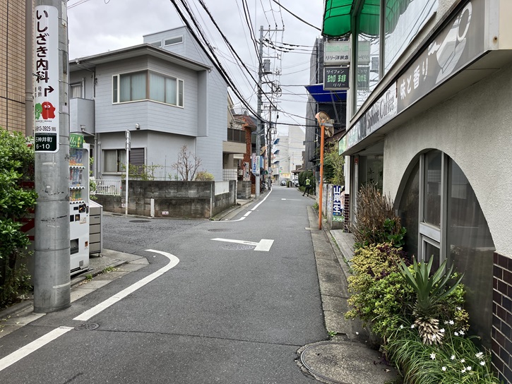 駅の南口から富士街道方向に商店街を歩きます。ごちゃごちゃとお店が入り組んだ典型的な郊外の駅前風景です。石神井公園駅入口交差点を直進し、ファミマの角で右折します。この通りが南田中から大泉へと続いていた古くからの道のようです。