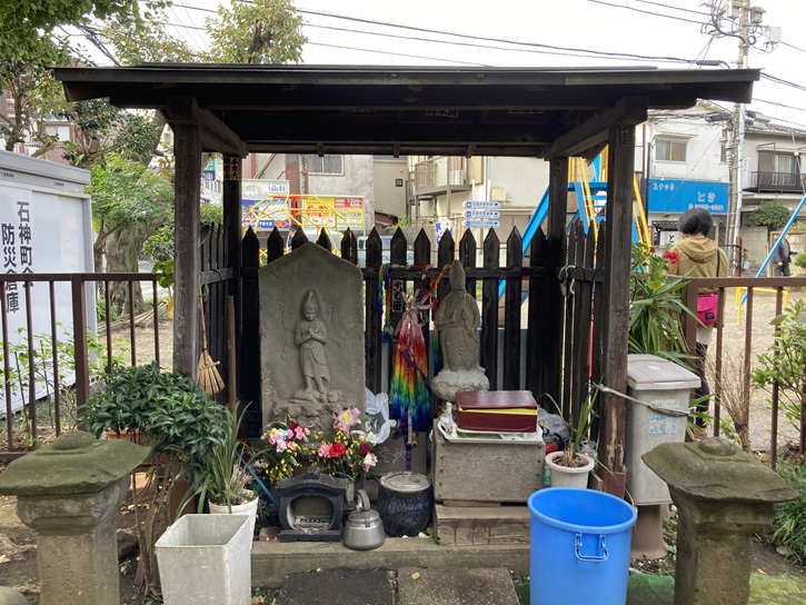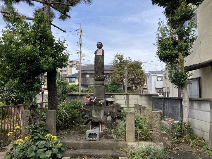 交差点の角に「子育地蔵遊び場」があり、その中に地蔵像が祀られています。昔からの街道筋だったことを窺わせます。